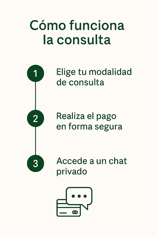 El proceso es simple: eliges tu modalidad de consulta, realizas el pago seguro en nuestra web y luego accedes a un chat privado donde podrás hacer tus preguntas. Durante 30 minutos recibirás orientación personalizada y recomendaciones prácticas enfocadas en tu bienestar natural.